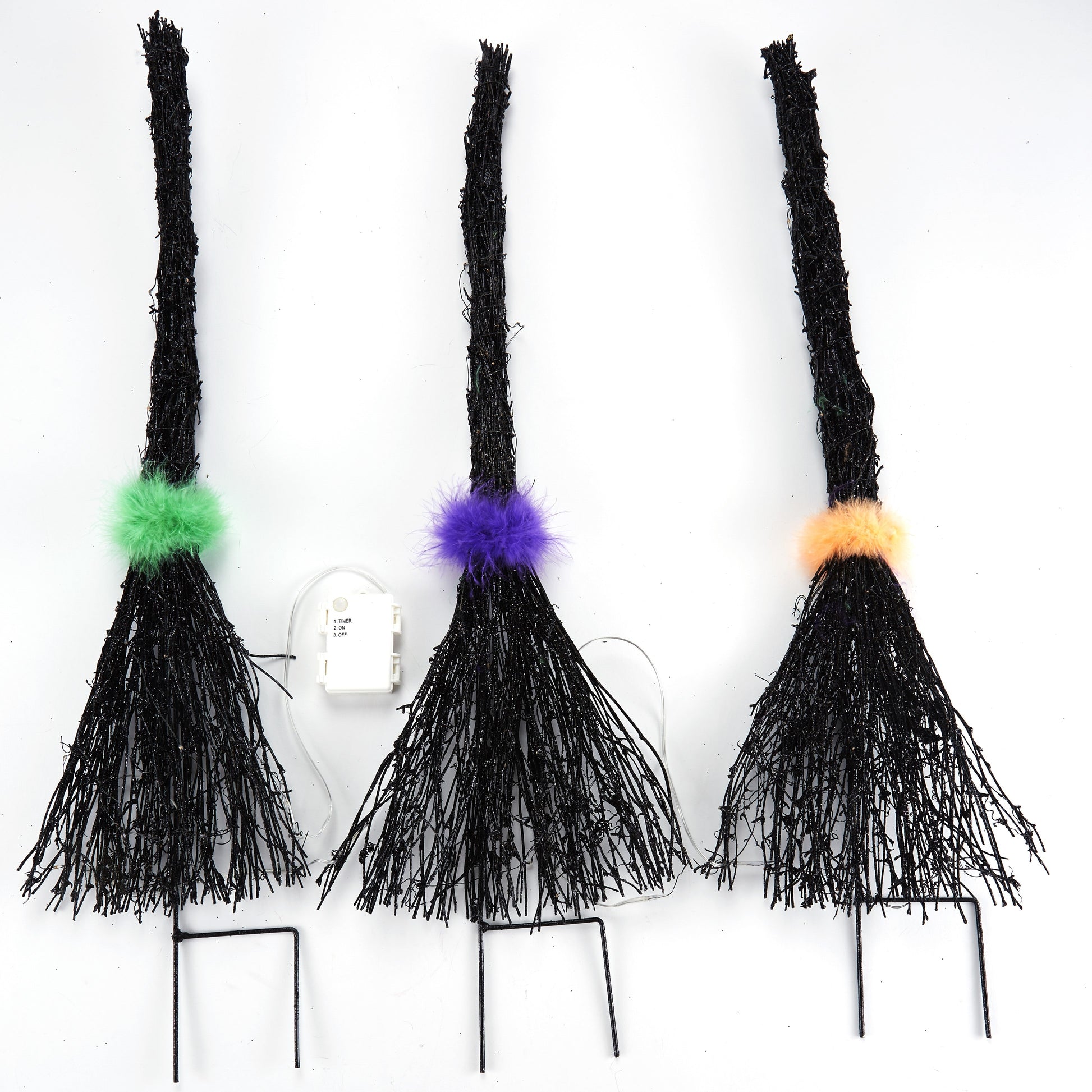 Lighted Halloween Witches Brooms Garden Stakes - Set of 3