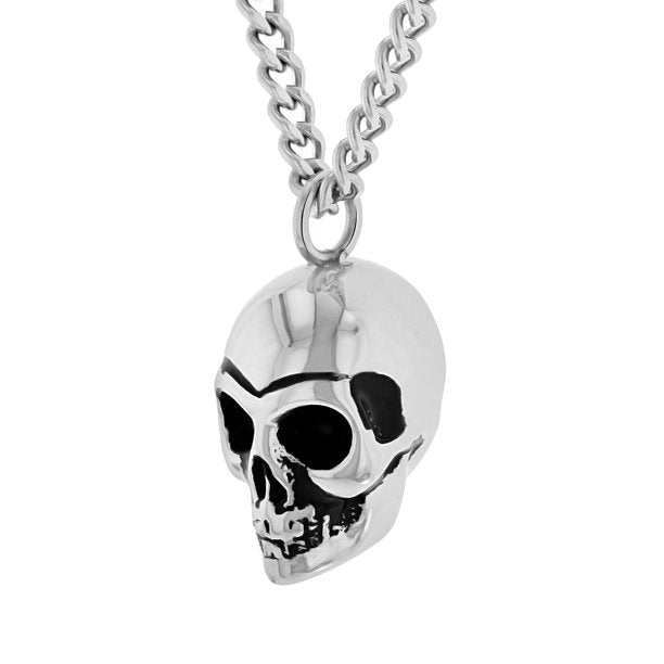 Mens Polished Stainless Steel Solid Human Skull Pendant Necklace
