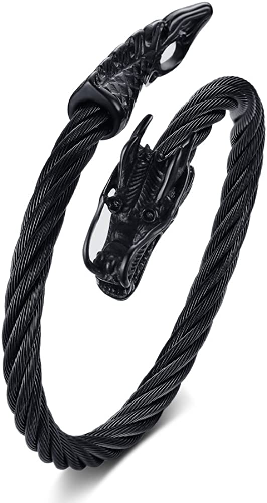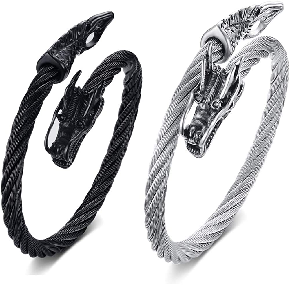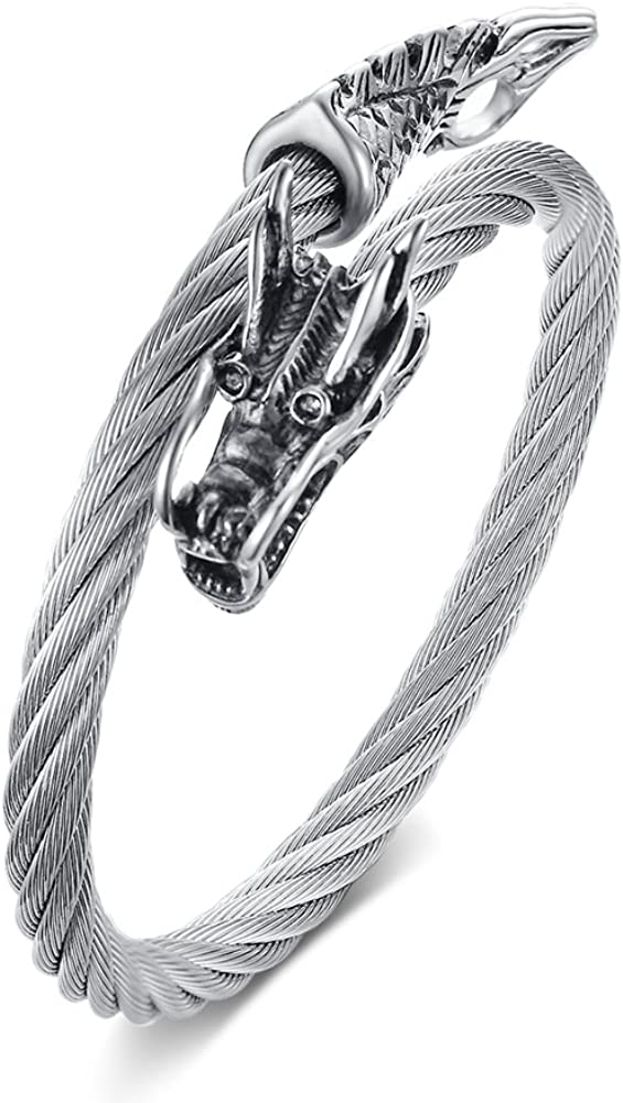 - 【Great Design】 Opposite dragon head & cable wire bangle & Ajudtable easy-Cool Punk bracelet,show your personality more masculine.Stainless Steel has increasingly grown as a popular metal choice for fashion Jewelry.Safe meterial,lightweight,comfortable,comfortfit style.