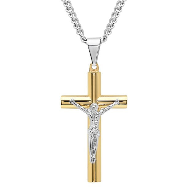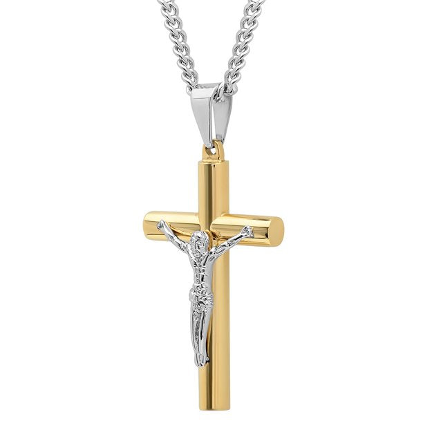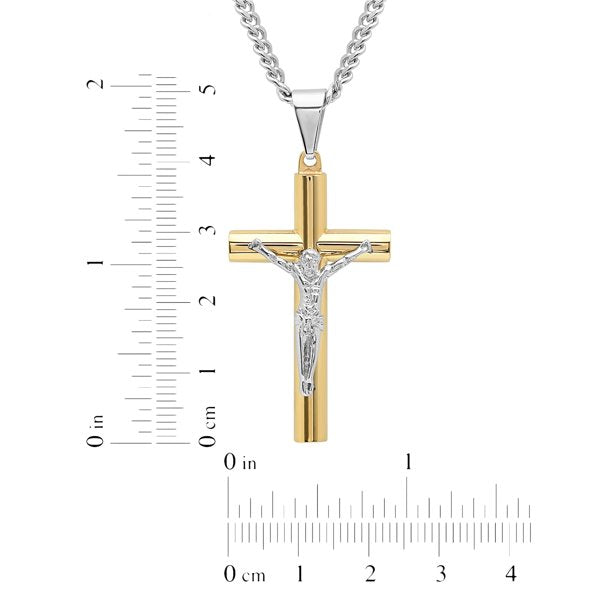 - A men's two-tone stainless steel crucifix pendant with a 24-in curb link chain necklace secured by a lobster claw clasp