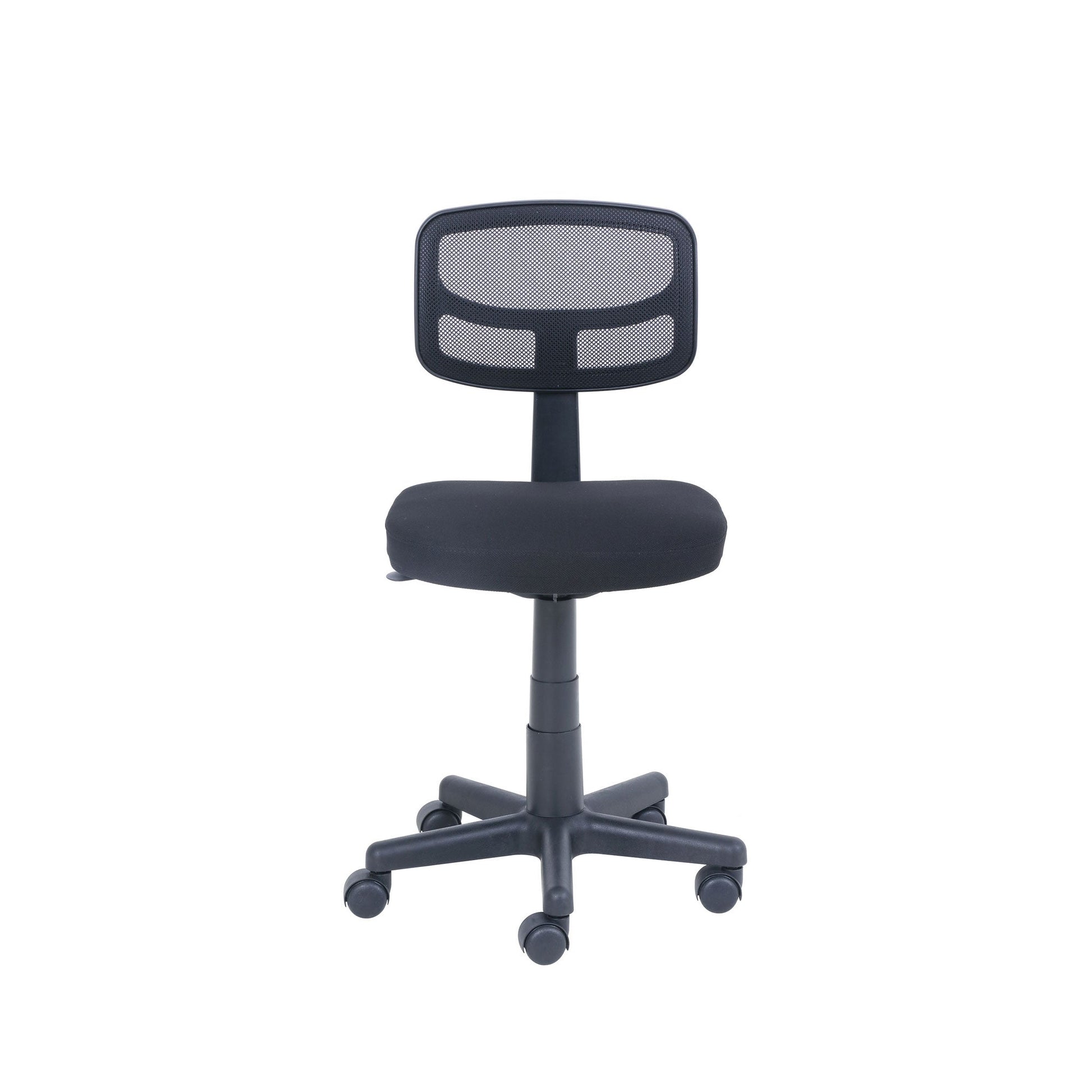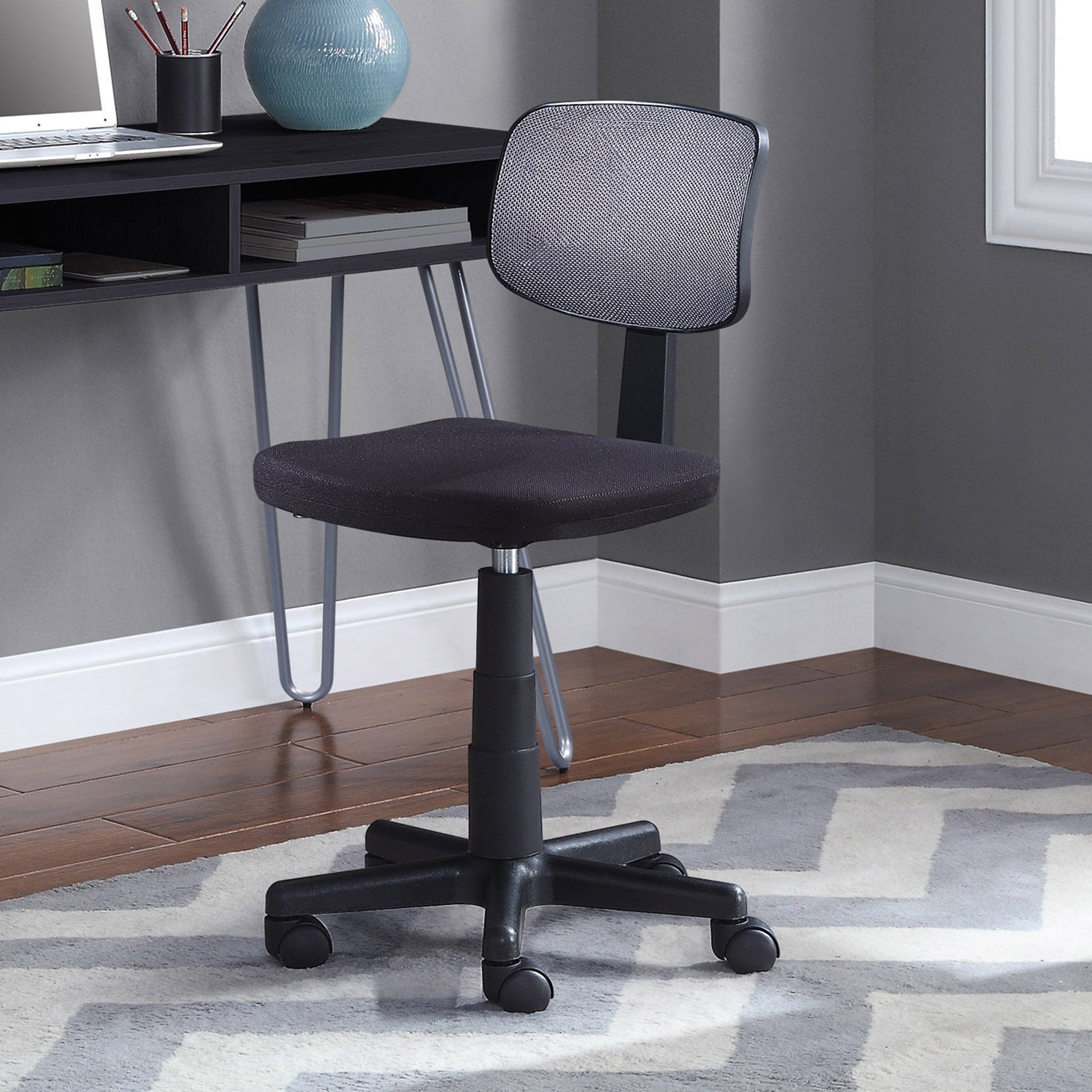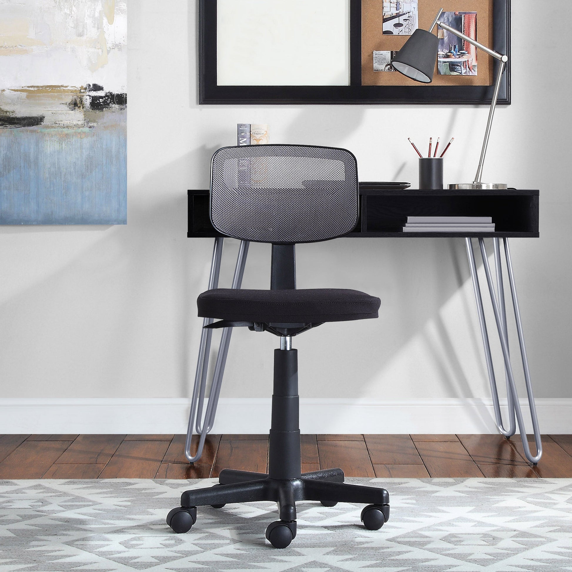 Mesh Task Chair is a blend of comfort, support and mobility. Backrest and seat cover are made of a lightweight breathable black mesh fabric upholstery. The high backrest provides a sturdy support for your back and the generously padded seat adds another layer of contoured comfort during those long workdays. Easily adjust the height of your chair with the convenient pneumatic lift lever to customize chair to fit you. A durable 5-star black nylon plastic base will withstand years of wear and tear with a textured finish. Durable dual caster wheels roll smoothly around the room and are built to last. The Mesh Office Chair will pair well with a variety of desk styles from contemporary to modern and everything in between. Compact design makes this a great chair for any space big or small. Whether in a cubical, home office or dorm room the Mainstays Black Mesh Task Chair provides the contemporary style and functionality you need. Mainstays Fabric Task Chair with Adjustable Height, 250 lbs, Teal: *- Back Type: High Back *- Material: Breathable mesh *- Color: Black Base *- Base Material: Durable Nylon Plastic *- Seat is generously padded with dense foam for long lasting comfort *- Dual caster wheels for easy mobility around the room *- Ideal for home office, dorm room or professional workspaces *- Pneumatic adjustable seat height *- A great fit with any home or office décor styles *- Assembly Required *- Dimensions: 18.25 in W x 19.25 in D x 30.25 in - 35.25 in H (46.36 cm x 48.9 cm x 78.74 - 89.54 cm) *