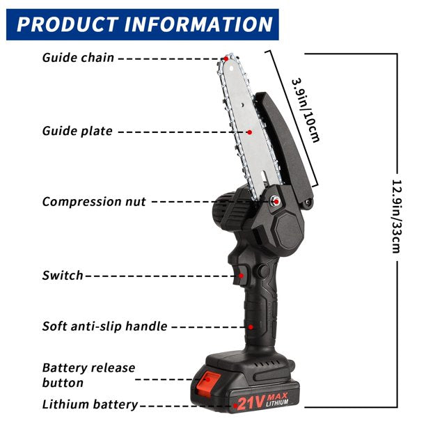 - 2 SIZES CHAINSAWSIt equipped both 4" and 6" chains, equivalent to GET 2 professional chainsaws for 1 price! Replace the chain size freely according to what size of the wood you need to cut. Own this battery chainsaw, you will get mini chainsaw 6 inch & mini chainsaw 4 inch for more widely application.