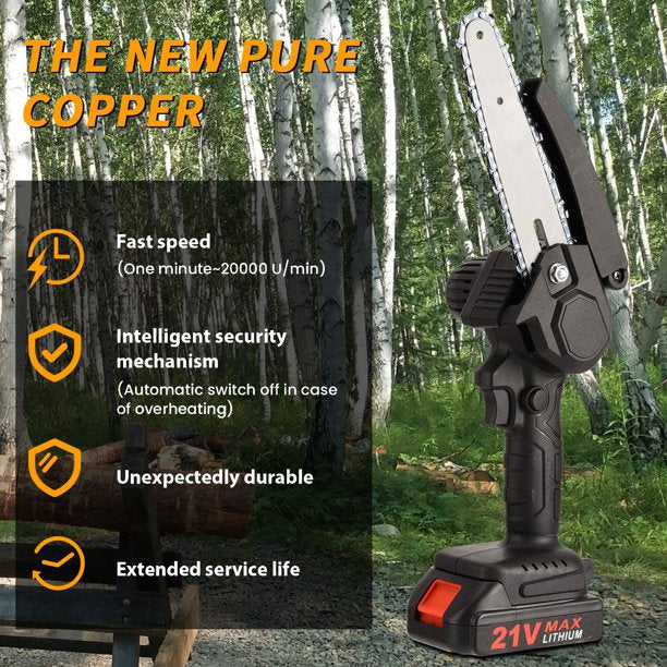 Power efficient cutting: Rechargeable mini chainsaw adopts 550W pure copper motor and 21V batteries make it speed up to19.69ft/s (6M/S), all lead to easy fast wood cutting.