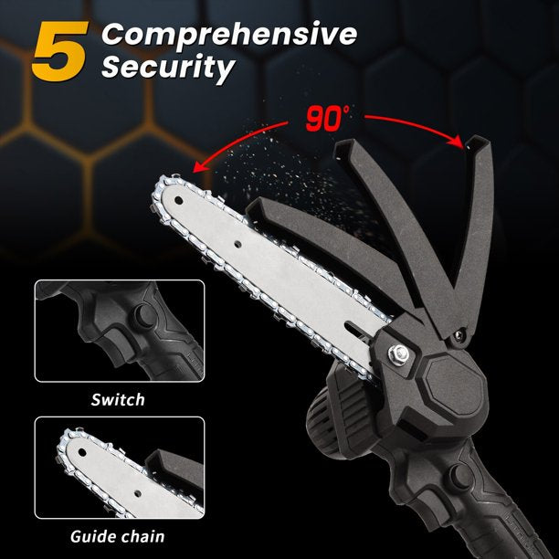Multifunctional safety protection: Portable cordless chainsaw equipped low kickback bar and a fixed washer,also equipped safety button.Gloves and goggles also prepared, give all-round protection.