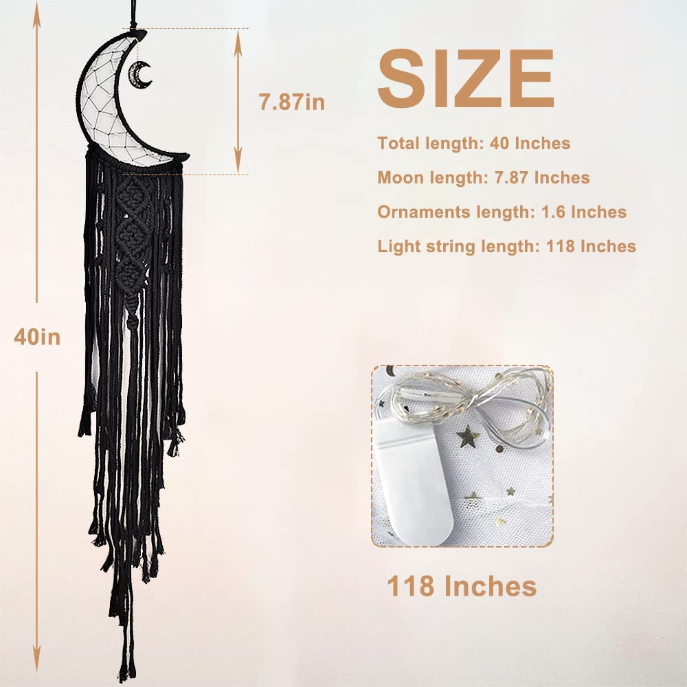 - EXQUISITE DESIGNOur moon dream catcher with lights is designed half-circle moon, hand-woven net in which there are different grids decorated with small white beads. At the head of the half-circle features a metal hollow out half moon pendant, and at the bottom features a lot of cotton ropes arranged irregularity and exquisite weave, add a dreamy and cheerful atmosphere.