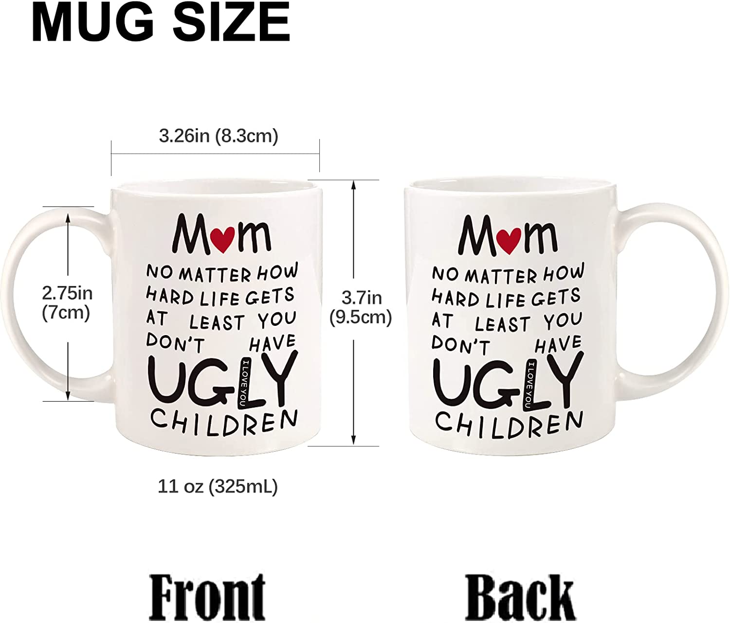 - 💖BEST MOTHERS DAY GIFTS FOR MOM💖Are you still looking for a suitable Mothers Day gifts for mom? This funny coffee mug can solve this problem, the mug designed for the mom, it is your best gifts choice.With the humorous words printed on both sides “Mom no matter how hard life gets at least you don’t have ugly children”, a priceless joke turns into a lovely memory mum gets to enjoy with every sip.