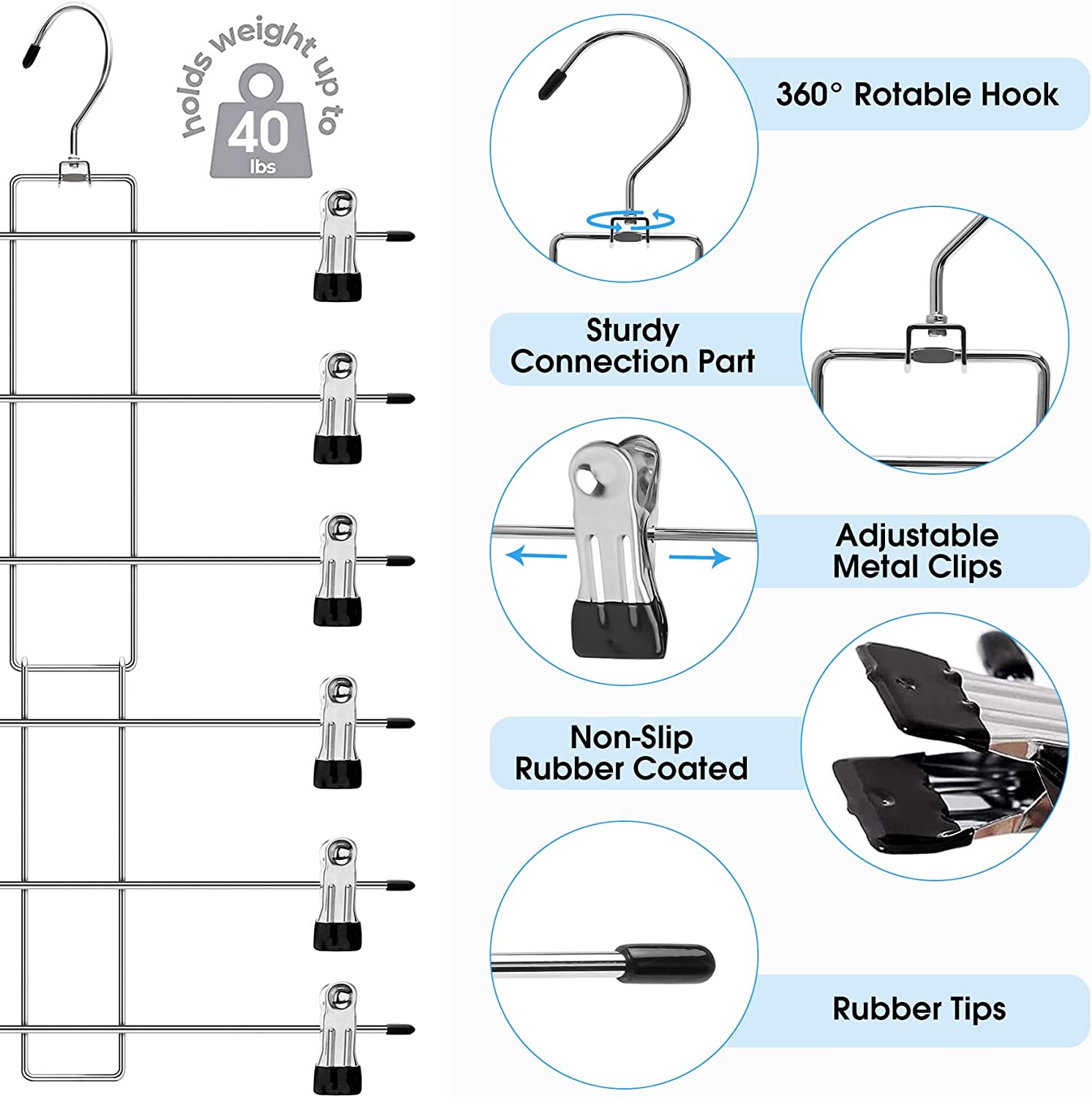 - 360 Degree Revolving Closet Organizers and Storage Clothes Hangers: Our closet storage pants hangers have a 360-degree stainless steel swivel hook, it is very convenient, you can just rotate the hook easily to face the orientation you want, no need you to struggle in repositioning the clothing every time, it will save you a lot of time finding your desired outfit for the day