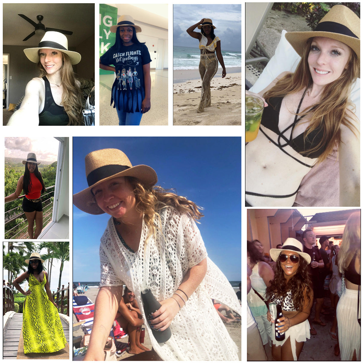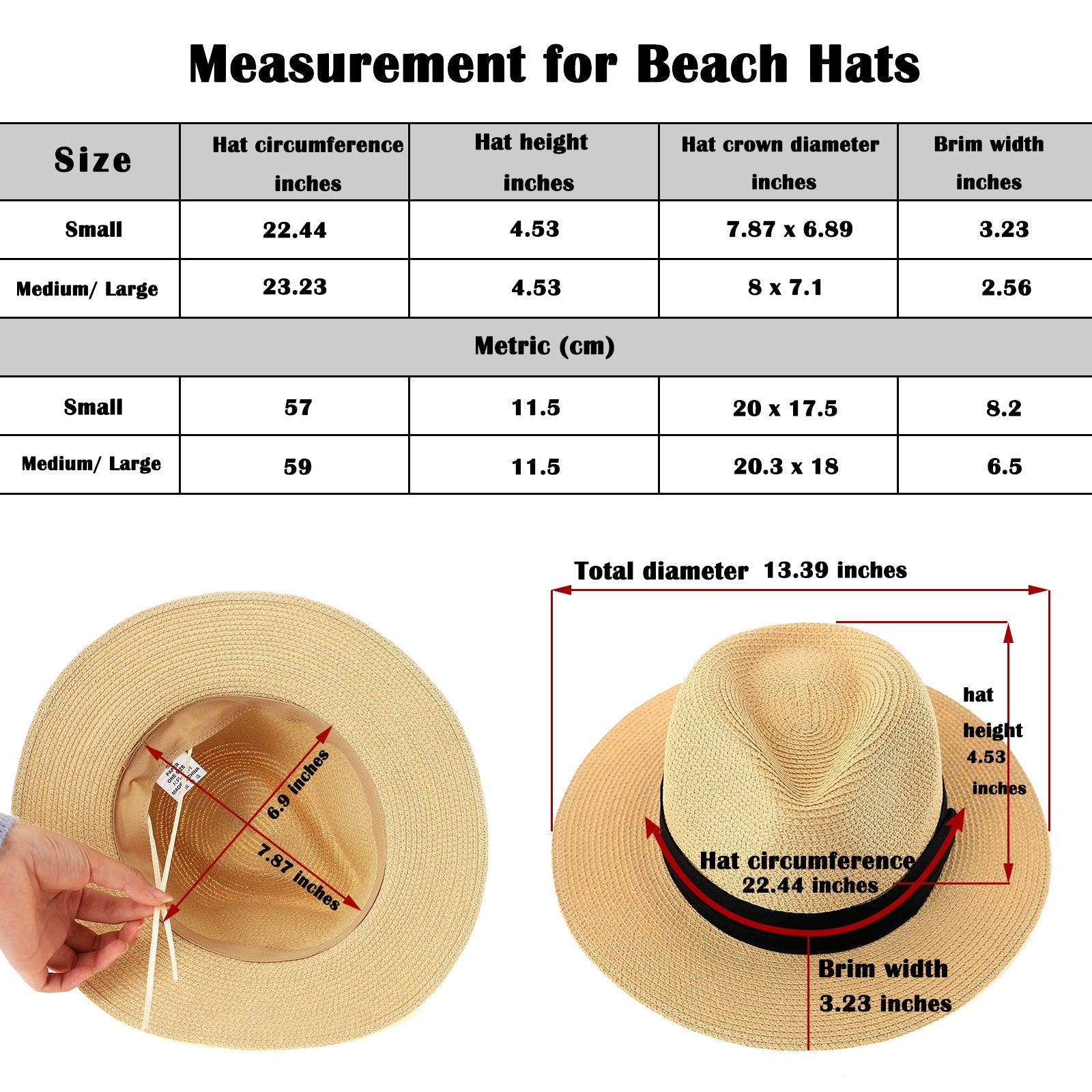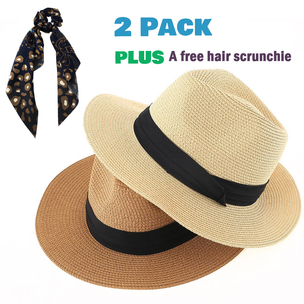 Imagine how you will be on the summer beach travel with nice dressing and one of these Panama hats on you. The Fedora Hat protects you from UV sunlight, providing you decent protection to your face. The straw Panama hat design releases hot air trapped inside your hair, keeping your hair cool in summer. These Straw Hats will fit perfectly on you since you can easily adjust the size through their built-in adjustable feature. What a great deal of these 2-color women Panama hats is! They are elegant looking, one size fit all, and superior quality and design. With their 100% money back policy with a 1-year warranty, take these Panama hats home now! *- One Size Fit Most - These women Panama hats fit perfectly for 95% of women with head size about 22.5 inches. They come with built-in adjustable strap, which allows you to adjust the size of the Straw Hat to fit your size. *- Two Colors Extra Value - Come with two Panama hats in two different colors. One is Ivory color, and the other one is a tan color. You will be able to pick your favorite color (beige or tan color) to fit your unique dressing style for travel. *- Superior Quality & Design - The Panama hats were made of natural paper straw material. In the summer, hot air trapped inside your hair can be released through the straw design, keeping your head in cool condition all the time. *- Classic Style & Great Sun UV Protection -You can take beautiful photos of yourself with one of these women Panama hats on you because of their classic design. You will be like a top model in your photos. Not only they look great on you, but also the wide Brim Straw Hat can protect you from the UV sunlight. *- Ideal Gift- These two packs of straw beach hats for women with a free hair scrunchie are great for gift giving to your families and friends. They must be impressed by the elegant beach hats. Product Specifications: *- Product Name: Women Panama Hat for Women 2 Pack Wide Brim Straw Hat for Summer Sun Beach Travel, Ivory and Tan Color *- Measurement: hat circumstance: 22.5 inches, brim 2.8 inches *- Material: Natural paper straw woven *- Fedora Hat Qty: 2pcs/order *- Color: Ivory or sand color x 1, Tan color x 1 *- Warning: Do not put these Beach Hat s into washing machine *- Foldable and easy to carry *- One size fits the most. Built-in adjustable strap allows you adjust the size. *- Natural paper straw woven. *- Color set: Ivory and Tan, Black and White, Navy and Pink *- Details: Decorative ribbon, stiff wide brim, fold-able, easy to carry. *- Take this home with you! Decorate Your Summer Days with 2 Valuable Beach Hats!
