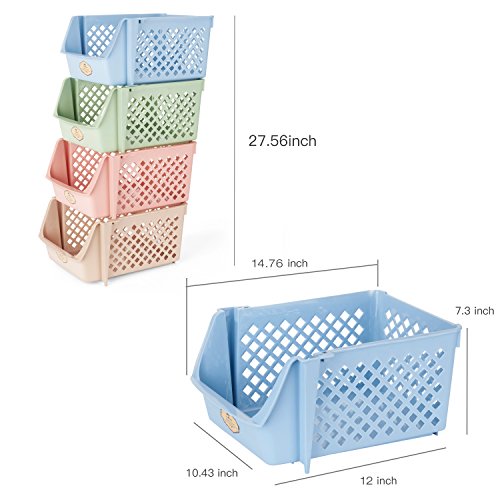 - KEEPS ESSENTIALS ORGANIZED AND VISIBLE - Stackable bins hold foods, toys, utensils, and toiletries without bending off. Set of 4, Each bin size: 14” x 11” x 7”.