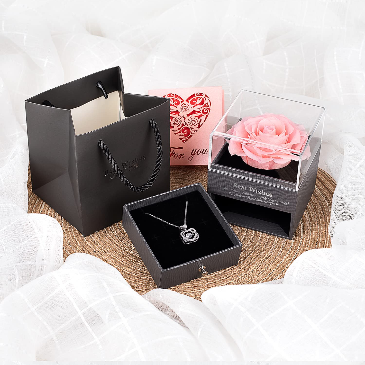 - 🎁Luxury 5-in-1 Gift Pack. The preserved rose with necklace is a beautiful and ready-to-give gift set, includes: 1 Eternal Rose + 1 Necklace +Jewelry Box + 1 Greeting Card+ 1 Gift Bag. And you can also use it to decorate your dressing table, living room, bedroom, or even your office area. Give the special one the eternal rose to convey your eternal feelings, and the dainty necklace will add an element of surprise. Write a little message on the card if you like.