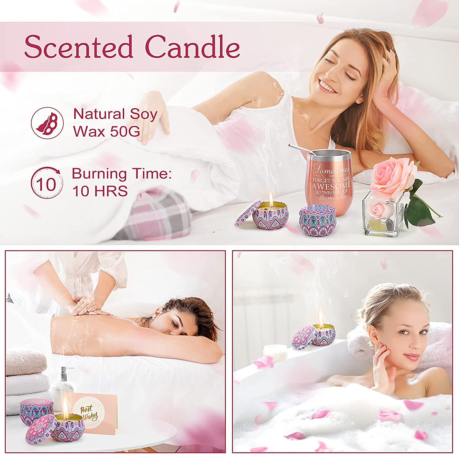 - Package includes: 1 x 12oz Tumbler, 1 x Socks, 2 x Scented Candle, 1 x Loofah, 1 x Bath Bomb, 1 x Straw and Cleaning Brush, 1 x Greeting Card