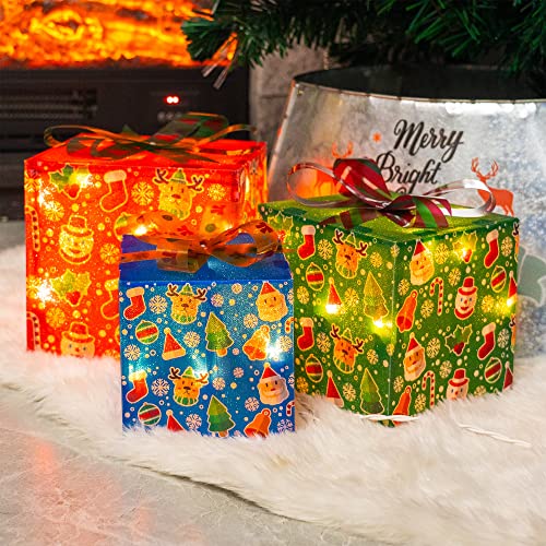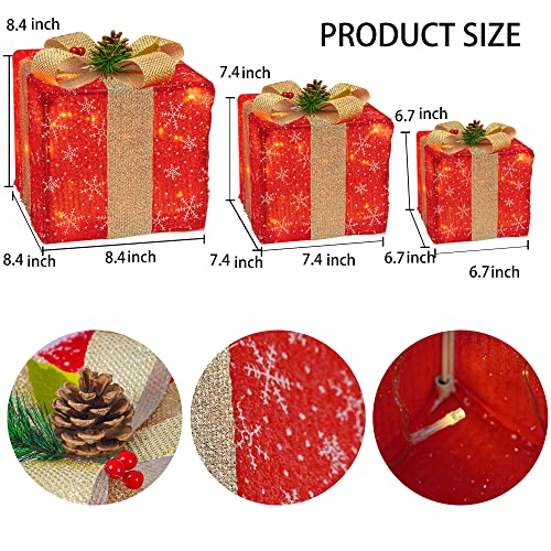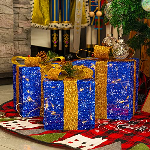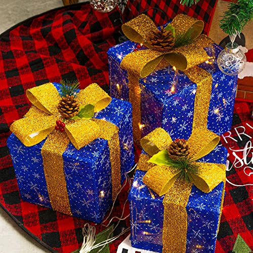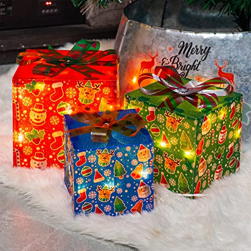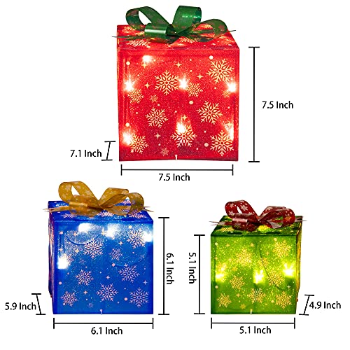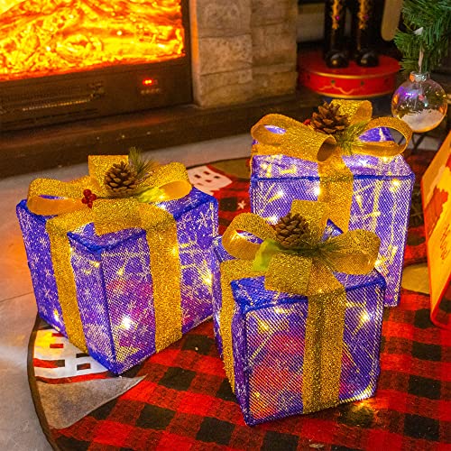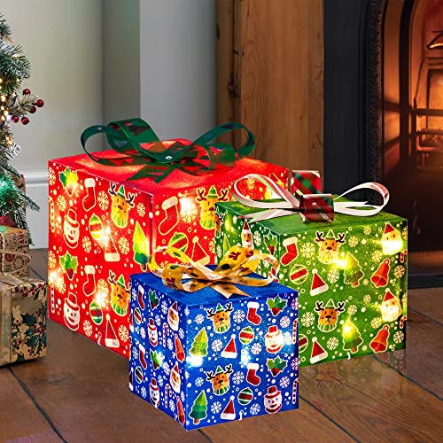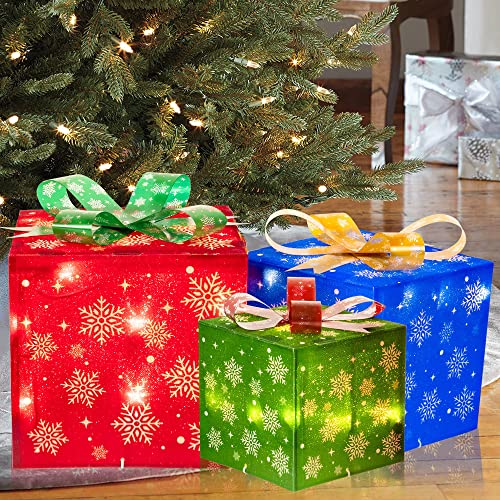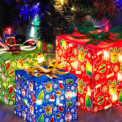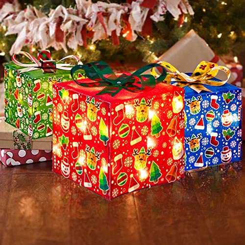 - Christmas lighted gift box: 3 sets of exquisite lighted present boxes (with many classical patterns and bows) are the best choice for Christmas, weddings, banquets, anniversaries, and Christmas decorations for houses, offices, restaurants, hotels, bars, etc. Decorate this beautiful lighted christmas packages in your home, they will be the perfect Christmas decoration for your home or yard.