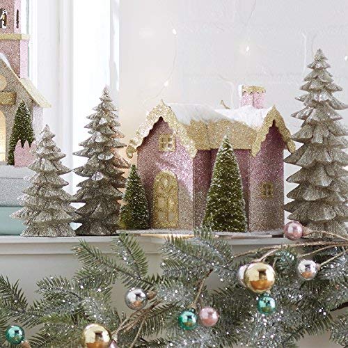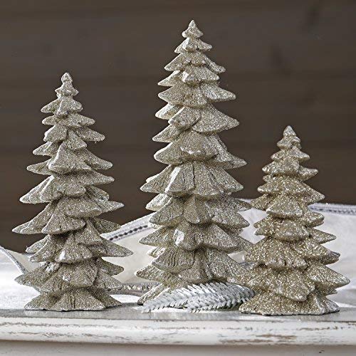 - Set of 3 sculpted trees are made of poly resin and coated in silver glitter 6-1/4 inches to 9.5 inches tall