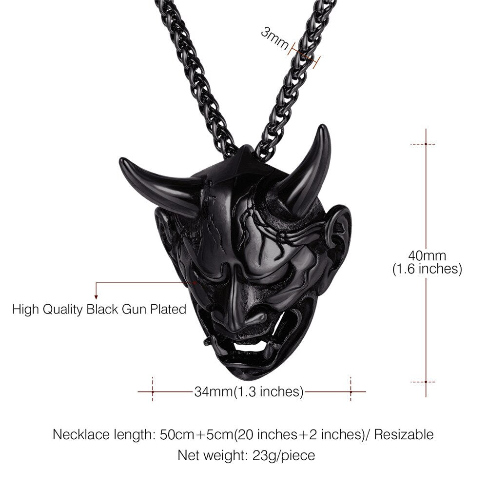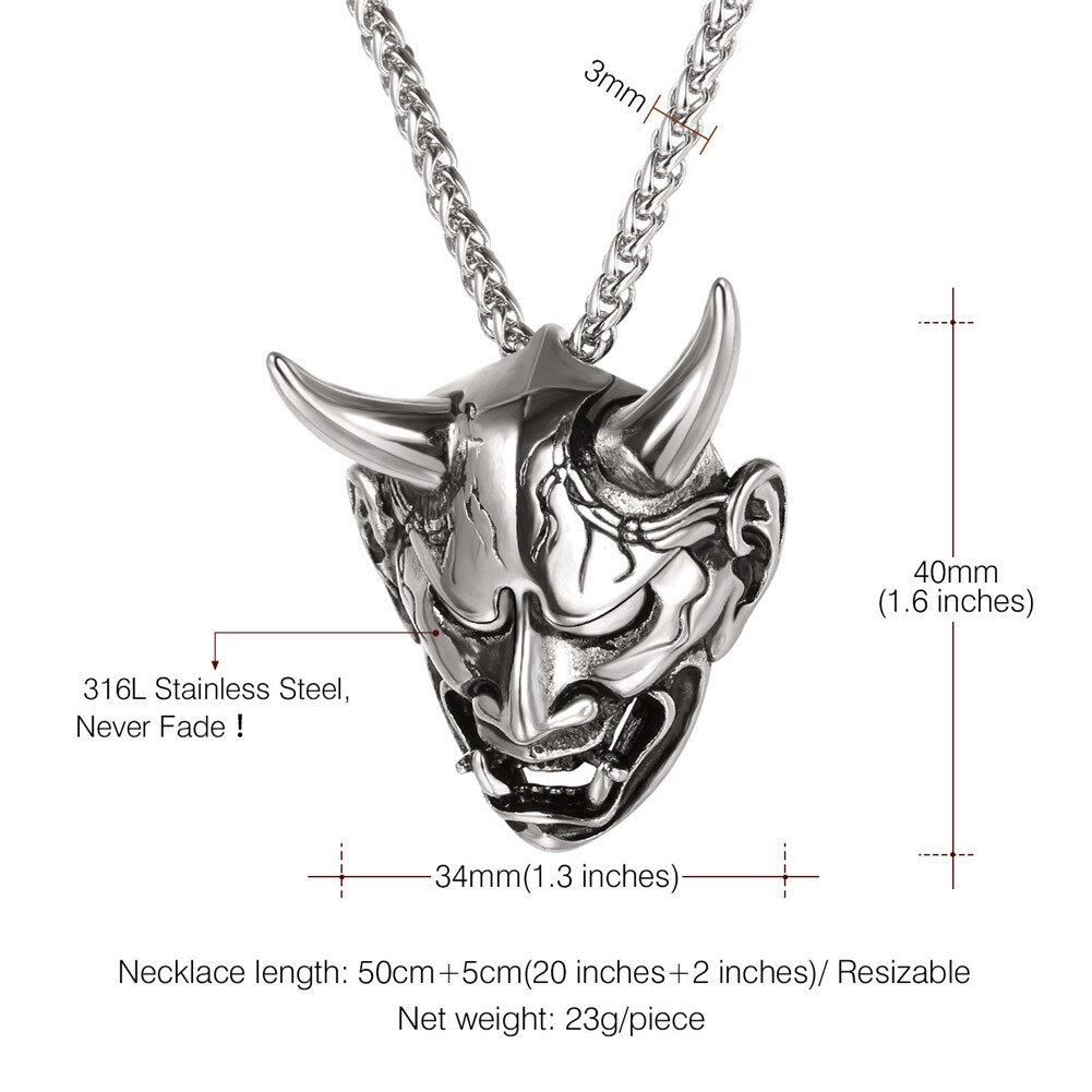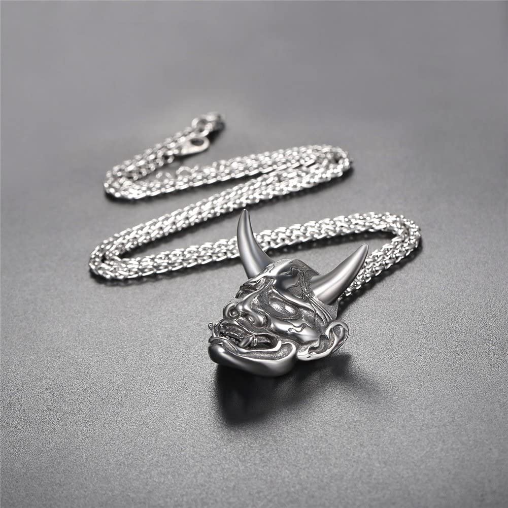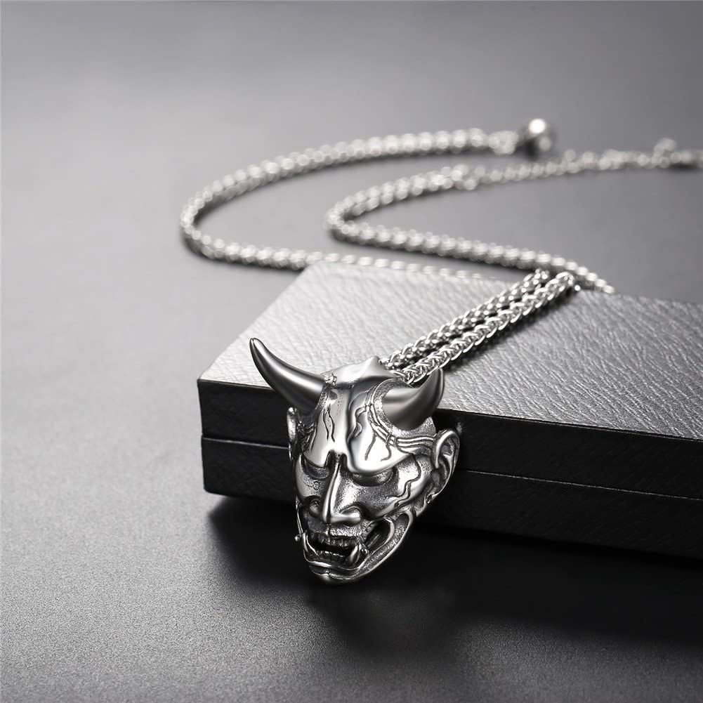 Stainless steel/925 sterling silver jewelry products which is suitable for Men and Women. Jewelry Care: - Keep away from chemicals and liquids. - Take it off when showering, swimming, sleeping and doing sports. - Clean it with polishing cloth and storage it in a dry jewelry box. Product Design: Appearance-Hannya Damon Mask; Function-Amulet / protection / decoration; Meaning of the Demon-wisdom.small horns and use dark magic to perform their evil deeds, such as summoning ikiryō to attack their enemies. Perfect Gift for Graduation, Father's Day. Big Sales for all of yours! *- Metal: Definitely made from 316L Stainless Steel, economic and skin friendly. Nice polished looking and solid wearing feeling. *- Style: Gothic, Vintage, Hip Pop, Punk *- Color: Silver *- Pendant size: 1.6 inches*1.3 inches *- Chain Length: 50cm+5cm(20 inch+2 inch) (Resizable) *- Suitable for: Men and Boys *- Gift Packed: 1 pendant necklace, 1 Gift box and a black velvet pouch.