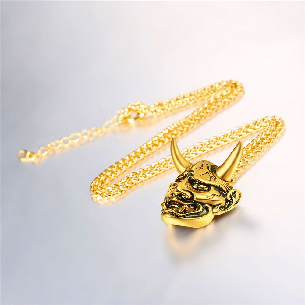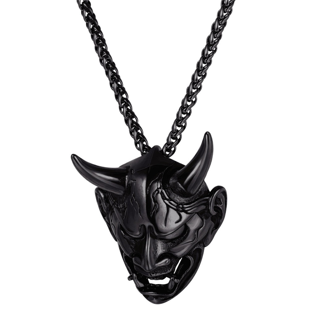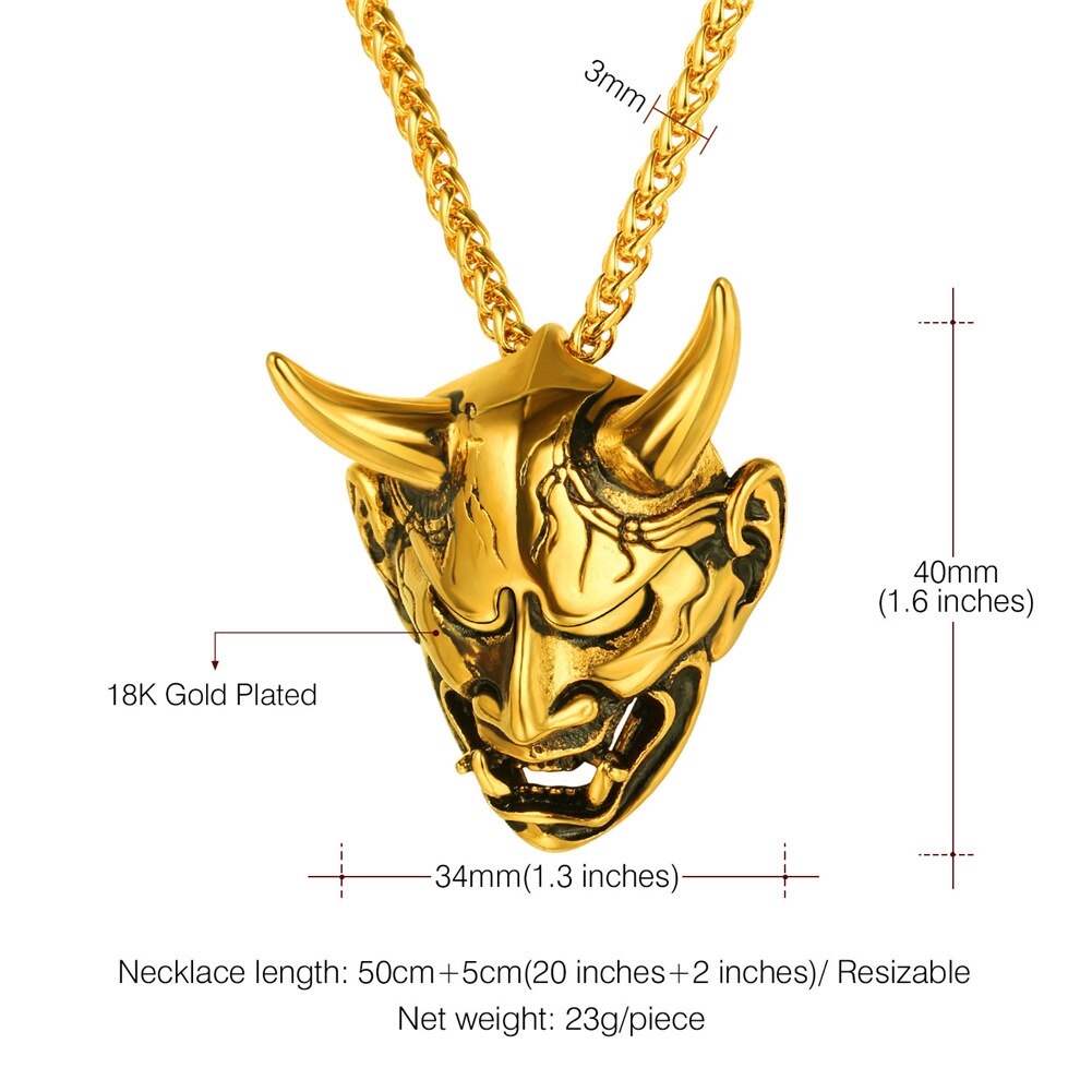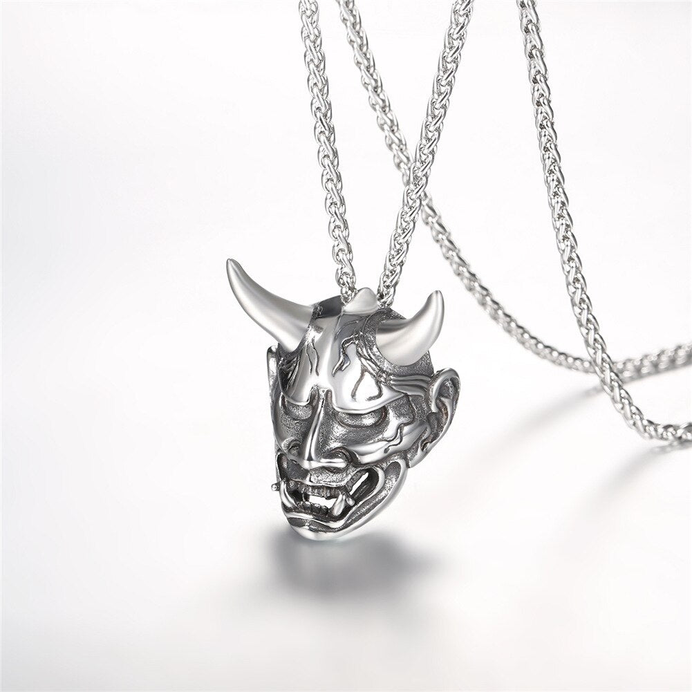 Stainless steel/925 sterling silver jewelry products which is suitable for Men and Women. Jewelry Care: - Keep away from chemicals and liquids. - Take it off when showering, swimming, sleeping and doing sports. - Clean it with polishing cloth and storage it in a dry jewelry box. Product Design: Appearance-Hannya Damon Mask; Function-Amulet / protection / decoration; Meaning of the Demon-wisdom.small horns and use dark magic to perform their evil deeds, such as summoning ikiryō to attack their enemies. Perfect Gift for Graduation, Father's Day. Big Sales for all of yours! *- Metal: Definitely made from 316L Stainless Steel, economic and skin friendly. Nice polished looking and solid wearing feeling. *- Style: Gothic, Vintage, Hip Pop, Punk *- Color: Silver *- Pendant size: 1.6 inches*1.3 inches *- Chain Length: 50cm+5cm(20 inch+2 inch) (Resizable) *- Suitable for: Men and Boys *- Gift Packed: 1 pendant necklace, 1 Gift box and a black velvet pouch.