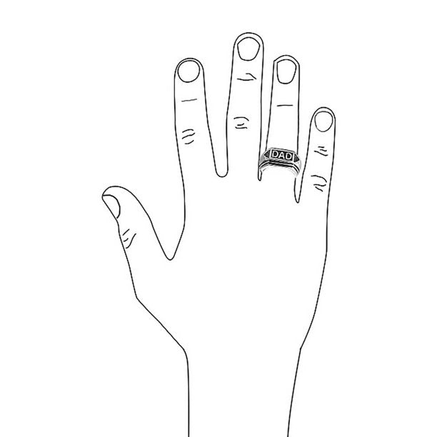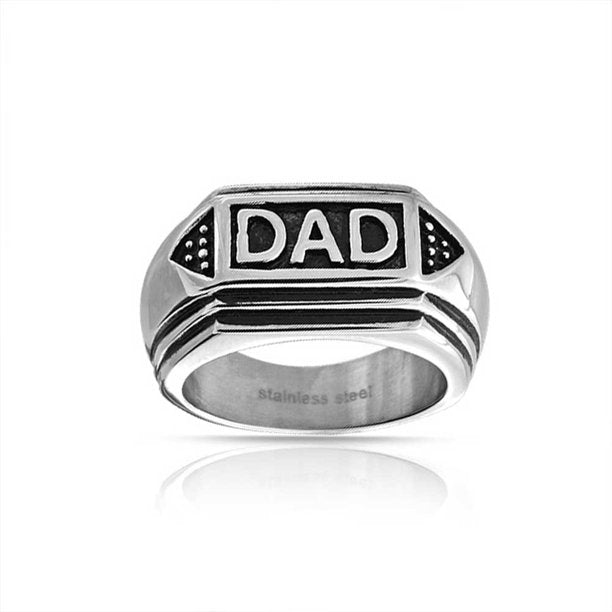 - Your fashionable father will love this two toned signet ring. A 5mm stainless steel band with geometric designs surrounding the proud bold title of DAD.