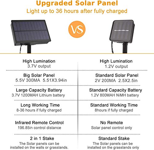 - 【8 Lighting Modes. Steady or Twinkle. with timer Remote 】Hand Press the “mode” button on the back of solar panel or remote control to cycle through 8 lighting effects:Combination,In waves,Sequential,Slo Glo,Chasing Flash,Slow Face,Twinkle Flash,Steady On.For saving the power,you can remote control the timer setting 3/5/8 hours.