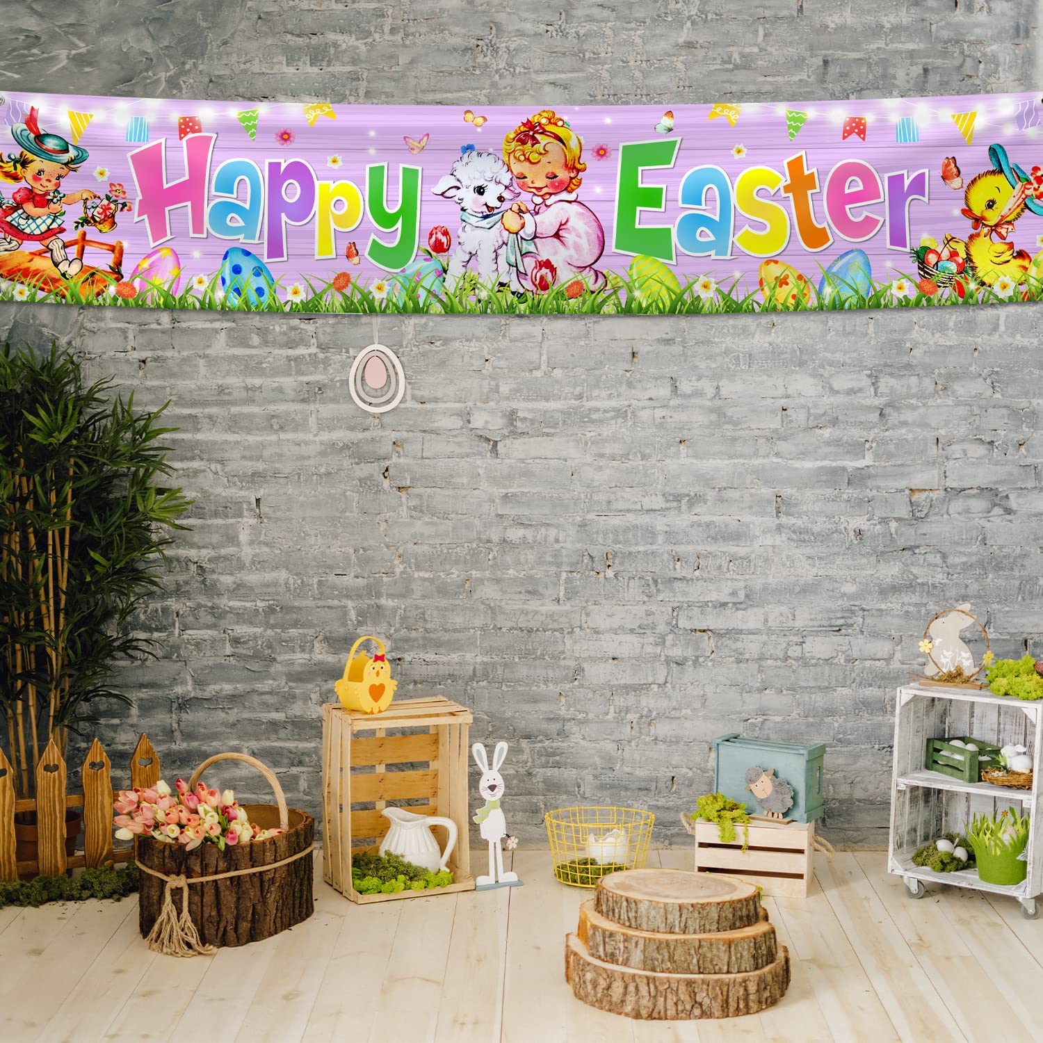- 【Purple Easter Decoration】 The four corners of the purple Easter banner are perforated for easy hanging. There are banners with little girls, little sheep, Easter eggs, little ducks and pink flowers. The size of the banner is about 9.8X2ft. There are various lovely Easter animal designs carefully designed for Easter. The overall style is lovely. "Happy Easter" is also printed on the picture. Our banner will definitely make your Easter more unique.
