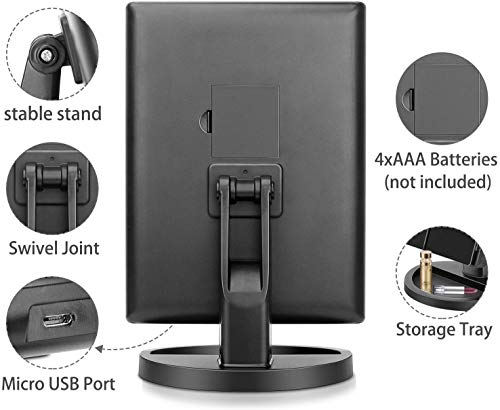 - BATTERIES AND MICRO USB POWERED: Operated by micro USB changing or 4AA batteries operated ( Battery not include, USB cord included), pls note that this lighted cosmetic mirror can't store power ). Made of high quality ABS plastic and high definition mirror glass.