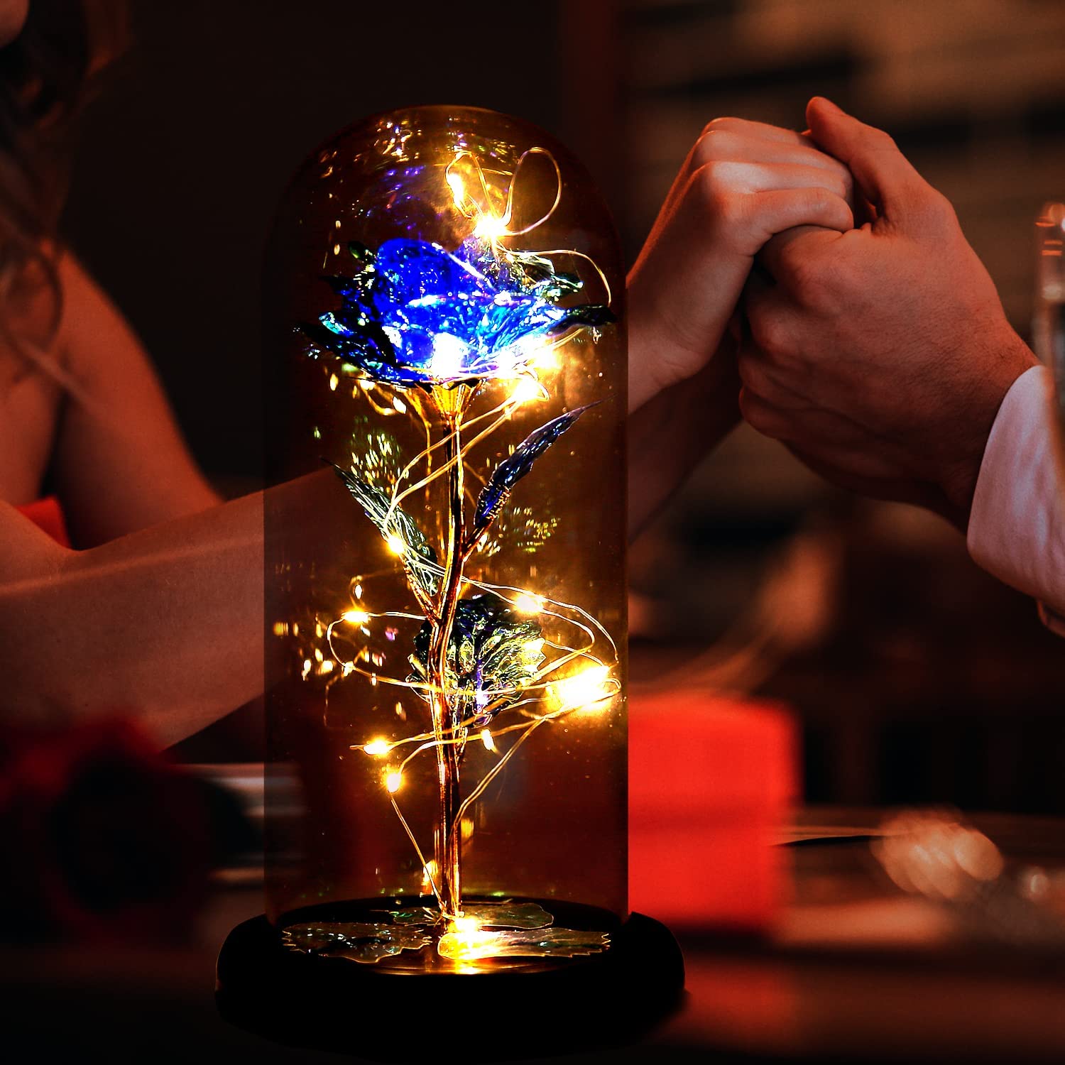 Valentines Rose Flower Gifts, Beauty & The Beast Rose, Galaxy Rose in A Glass Dome w/ LED Light, Blue