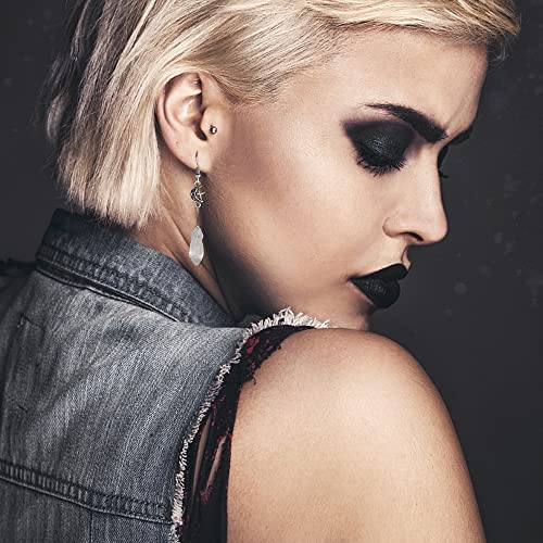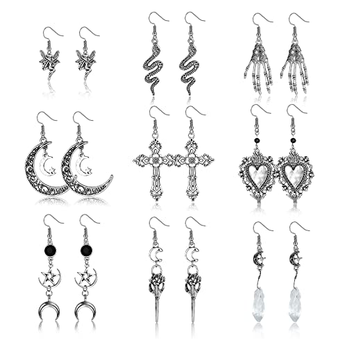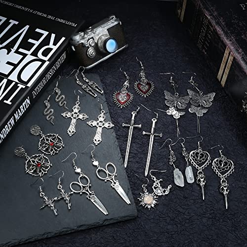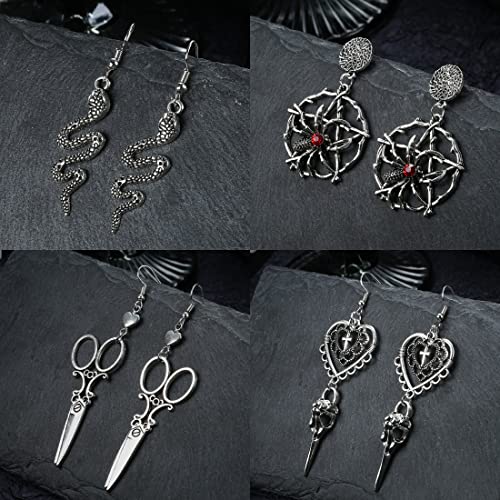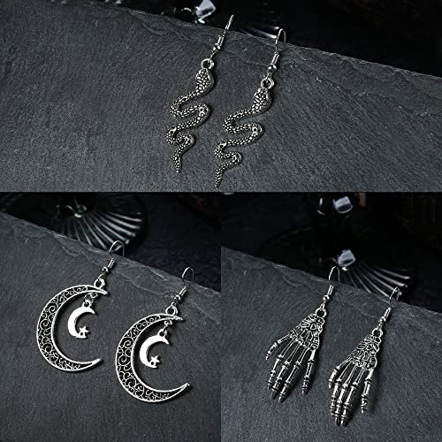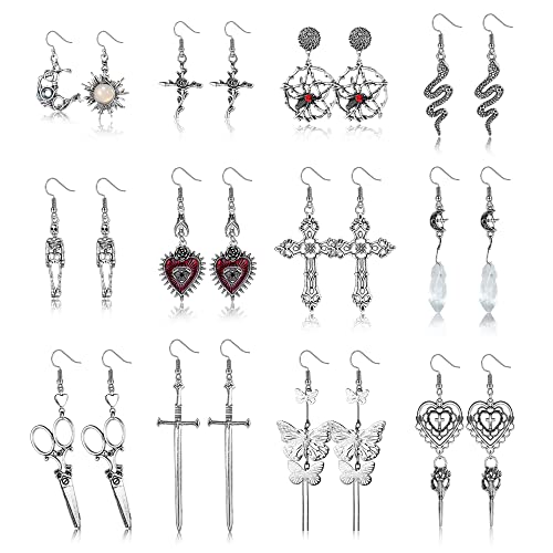 - 【Diverse Styles】12 pairs gothic earrings with different styles, adopt evil eye red rose heart earrings, snake earrings, skull skeleton earrings, butterfly earrings, moon and sun earrings, dagger earrings, clear quartz earrings. Goth jewelry of unique, mystery and punk style, are great accessories for halloween and daily, make you more cool and stylish.